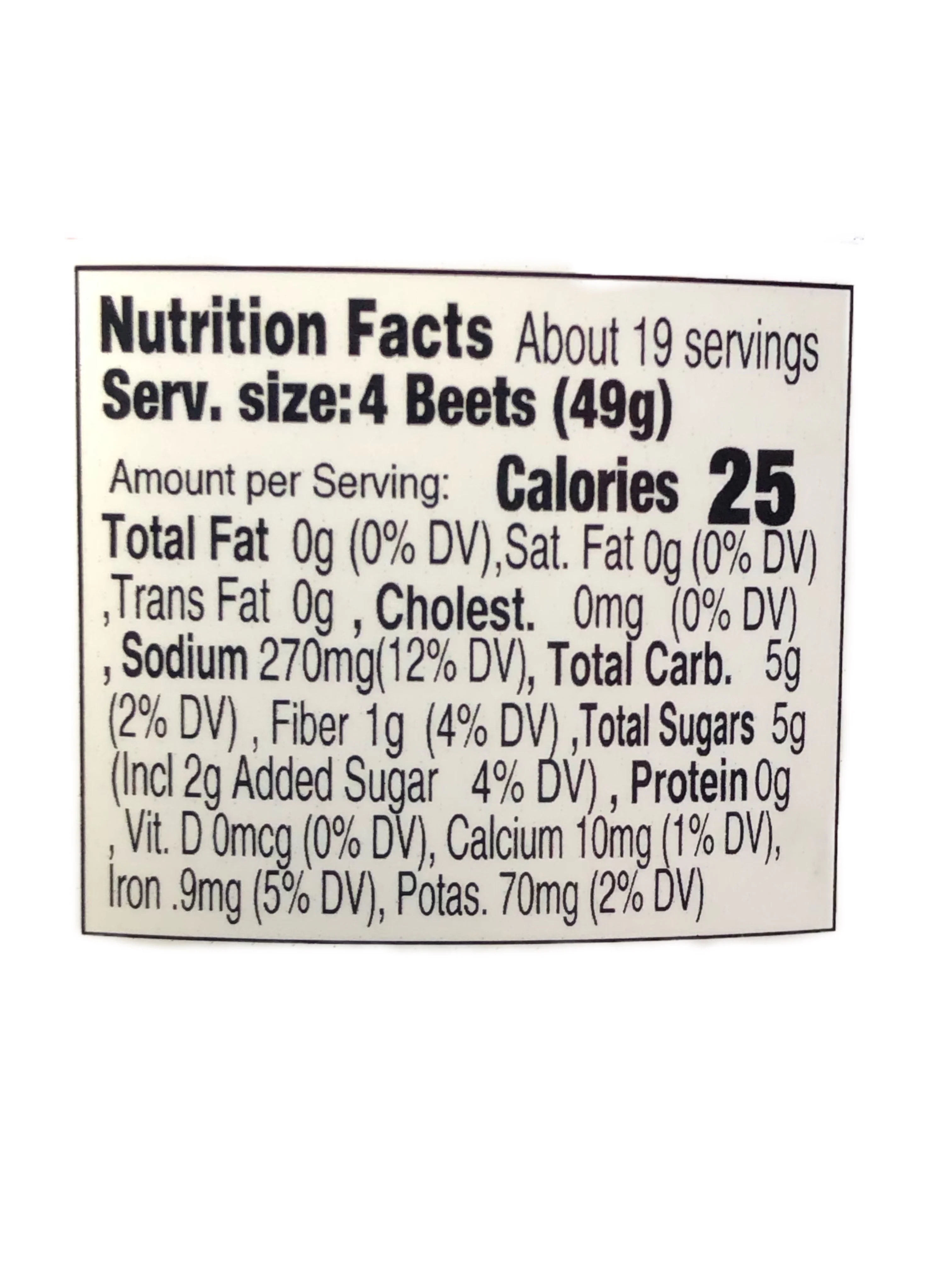 Ingredients: Beets, Vinegar, Water, Sugar, Salt, Spices.