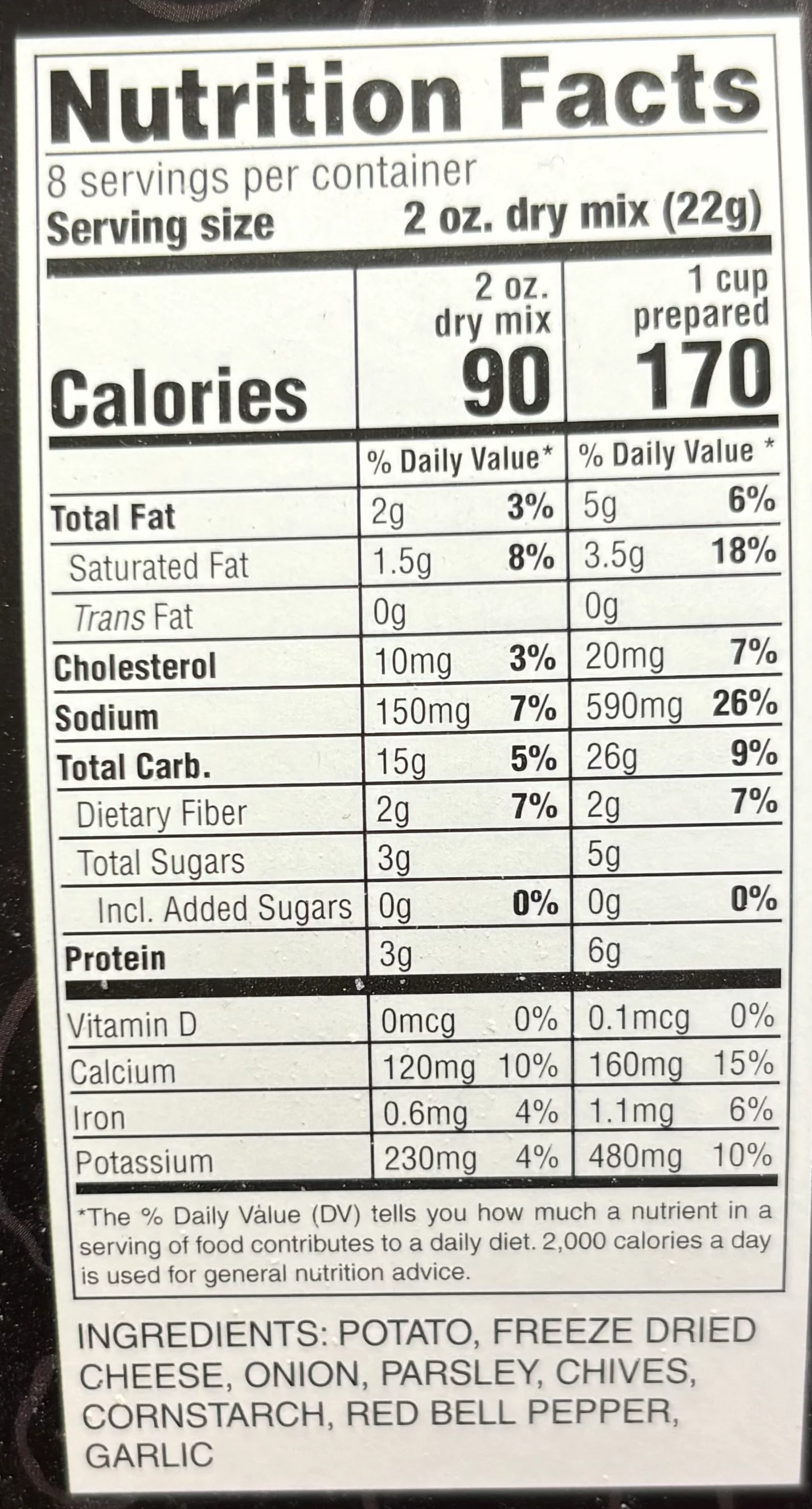 Contains:Â potatoes, freeze-dried cheddar cheese, onions, garlic, parsley, chives, herbs and spices
